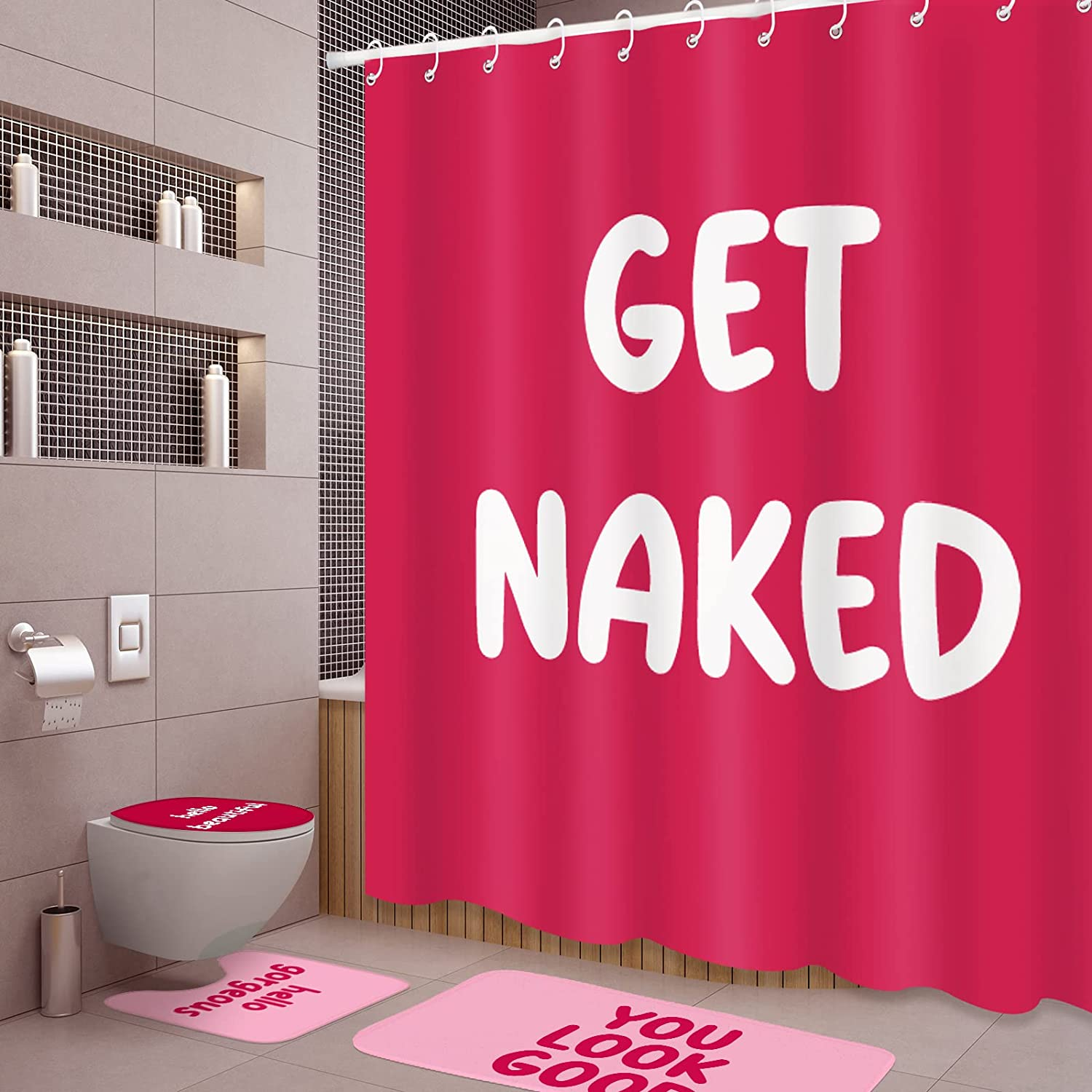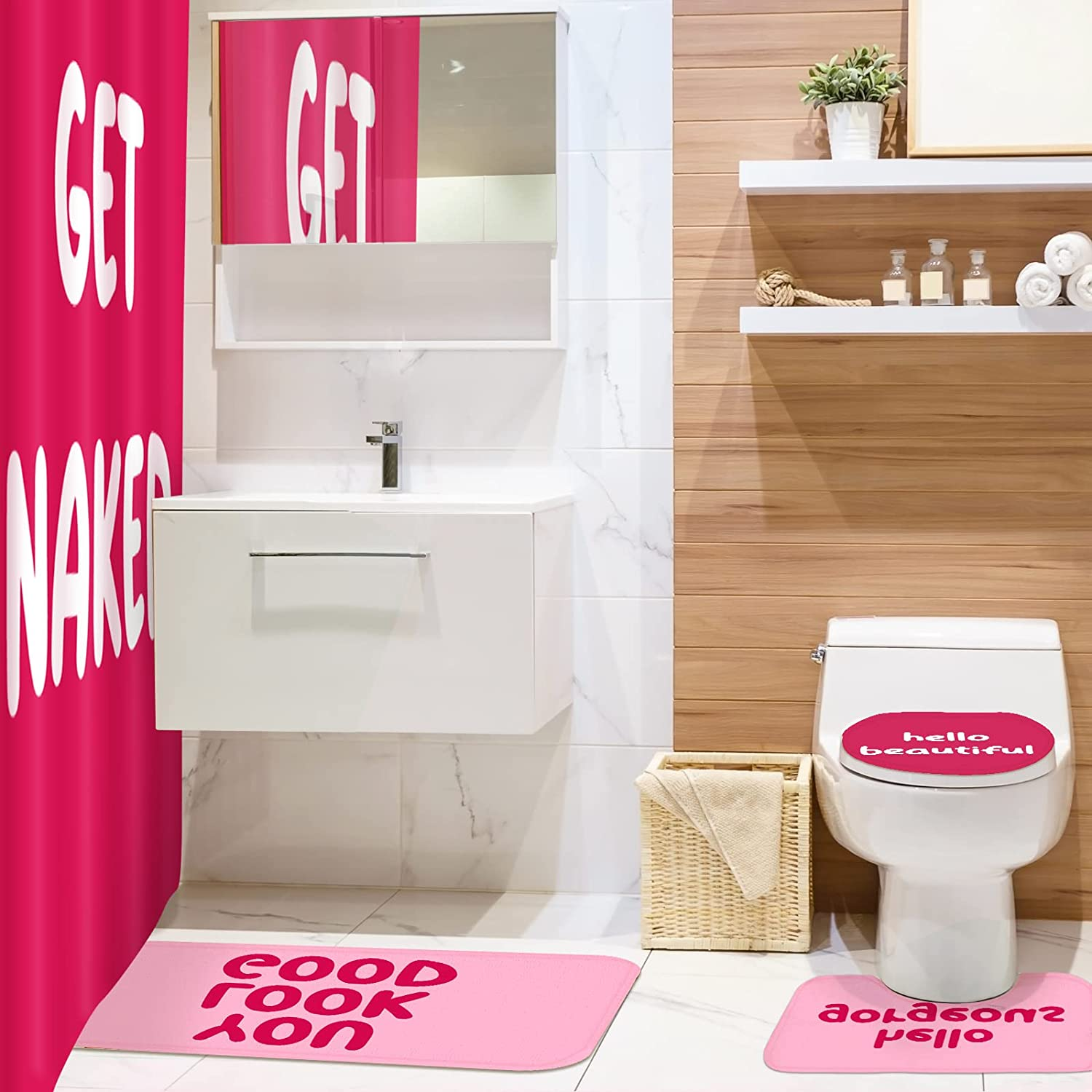 - What You Will Receive: the package comes in 1 piece of get naked shower curtain, 1 piece of you look good fun bathroom rug, 1 piece of hello gorgeous U shaped contour rug, 1 piece of hello beautiful toilet lid cover, and 12 pieces of hooks, nice combination for your bathroom