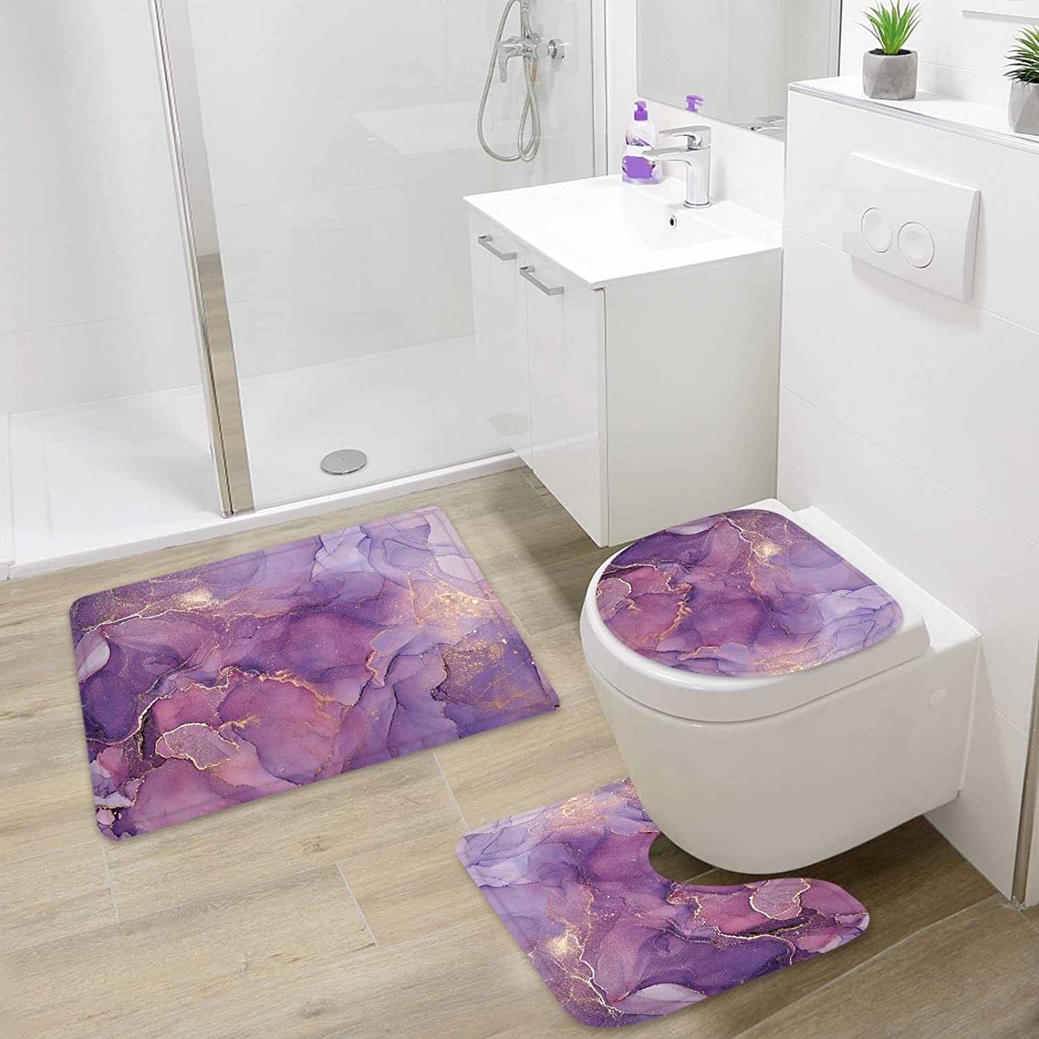 4 Pcs Purple Marble Shower Curtain Set with Non-Slip Rugs, Toilet Lid Cover and Bath Mat, Lavender Bathroom Decor Set with Shower Curtain and Rugs and Accessories