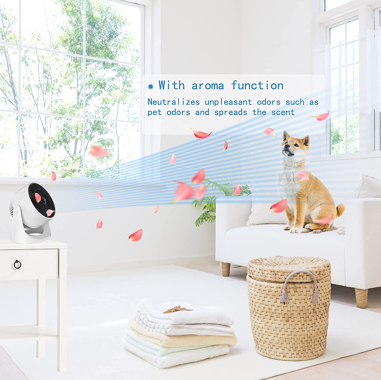 - 【Air Circulator with Fragrance Sponge 】Rotate the aroma cap ,add 2-3 drops of essential oils (Not Included) into pad under the cover, Turn on the table fan, then fragrance will flow with air movements, you can enjoy a soothing smell by placing different flavor tablets based on your needs.
