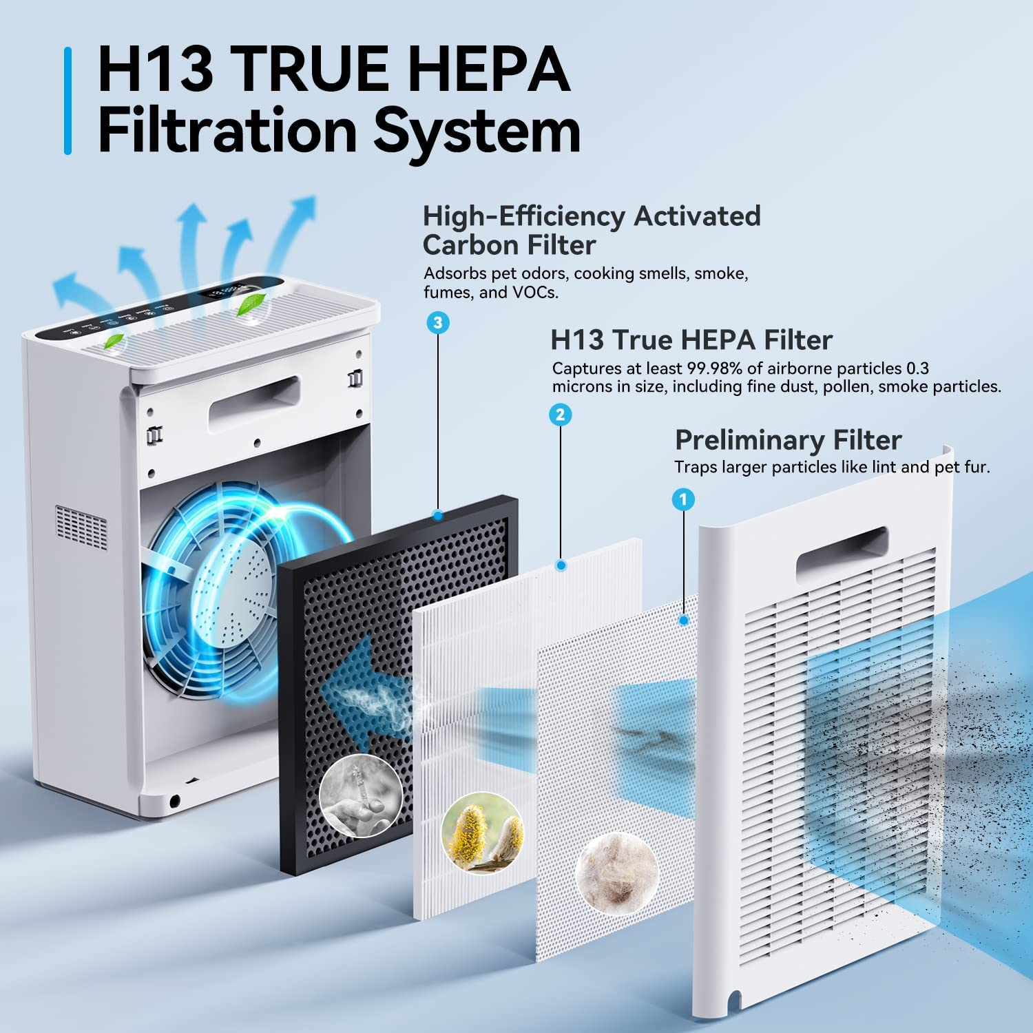 • [POWERFUL 3-STAGE FILTRATION SYSTEM] Combines Pre-Filter, H13 True HEPA Filter, and Honeycomb Activated Carbon Filter in one, effectively captures and reduces 99.98% of airborne particles 0.3 micron in size, such as dust, pollen, smoke, pet dander, and cooking smells. This home air purifier can detect air quality and display PM2.5 (reference value) on the panel, 100% ozone-free, never use UV-C lights, the first choice for healthy living.
