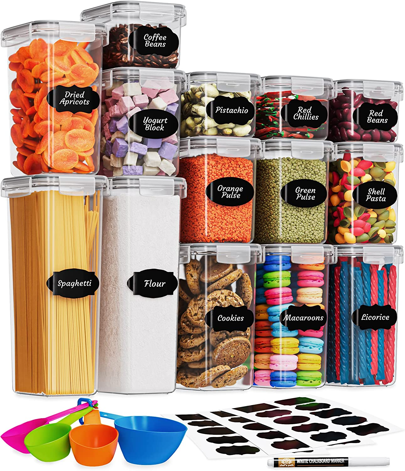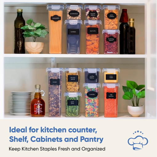 Airtight Food Storage Containers Kitchen Organization Keep your pantry organized with these BPA-free plastic food containers. This pantry organizer set will save you time and space in the kitchen while simultaneously adding to its decor. Our containers are stackable, allowing you to get rid of messy cabinets and kitchen counters.