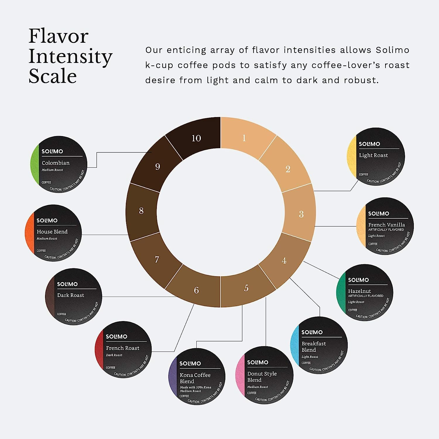 Solimo Variety Pack Light and Medium Roast Coffee Pods are made from 100% Arabica beans. In Breakfast, Kona and Donut Style blends. Compatible with 1.0 and 2.0 k-cup brewers, make your cup to order with Solimo coffee pods.