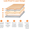 - 5-layer construction with absorbent core that turns liquid into gel on contact
