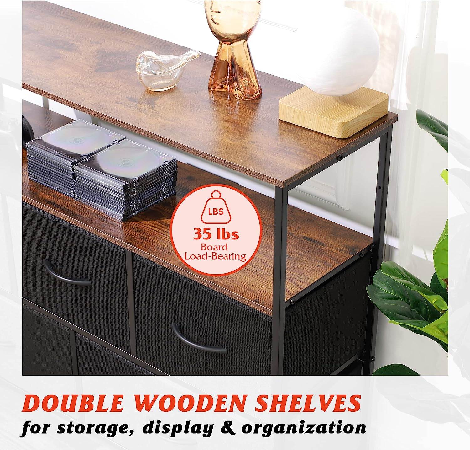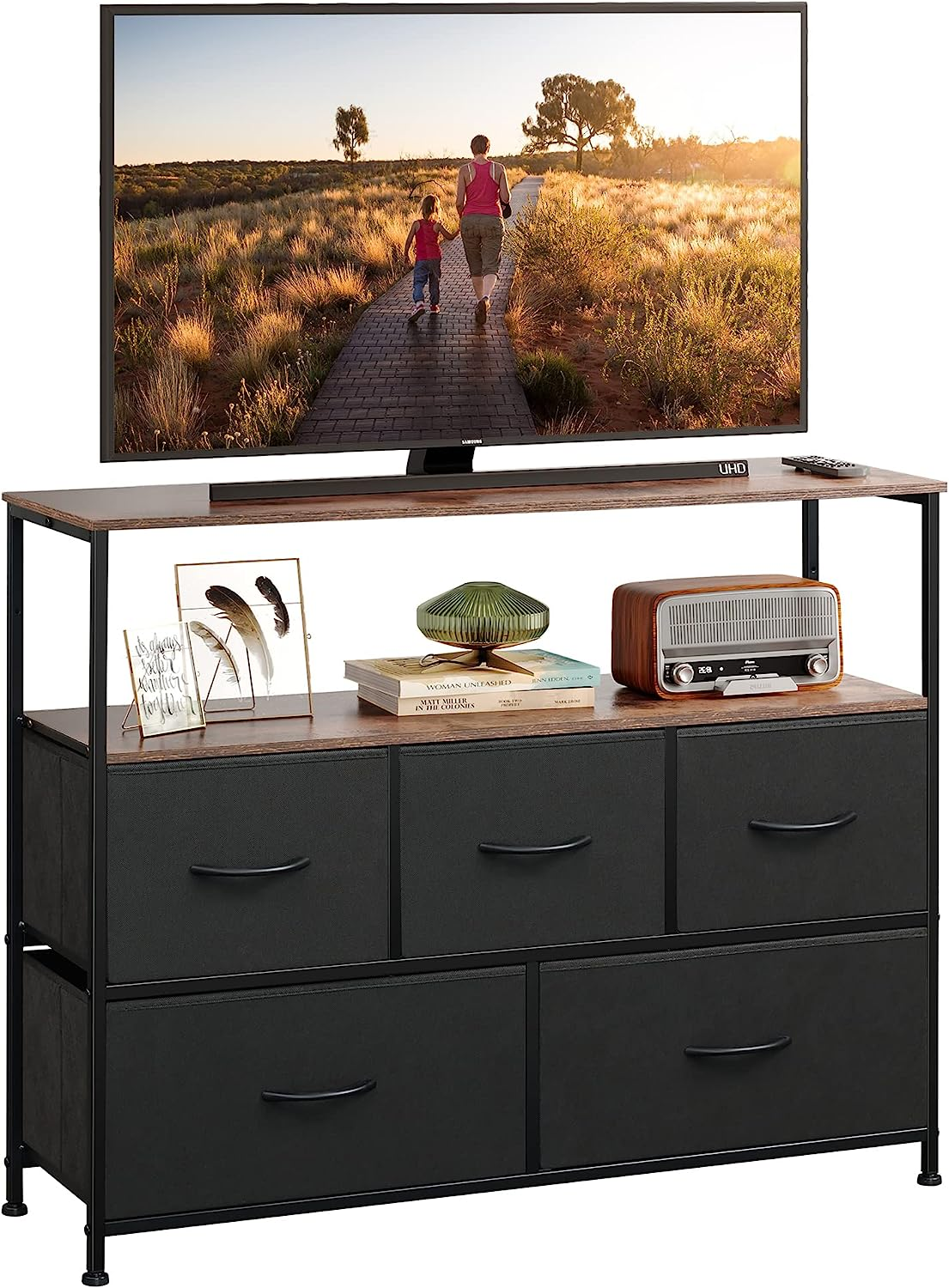 - TV Stand: Measured 39.4″ L x 11.8″ W x 30.7″ H, the chest of drawers can also be used as TV stand. This media console table is ideal for television up to 45″. The fabric bins are great to store CDs, DVDs, game controller, etc.