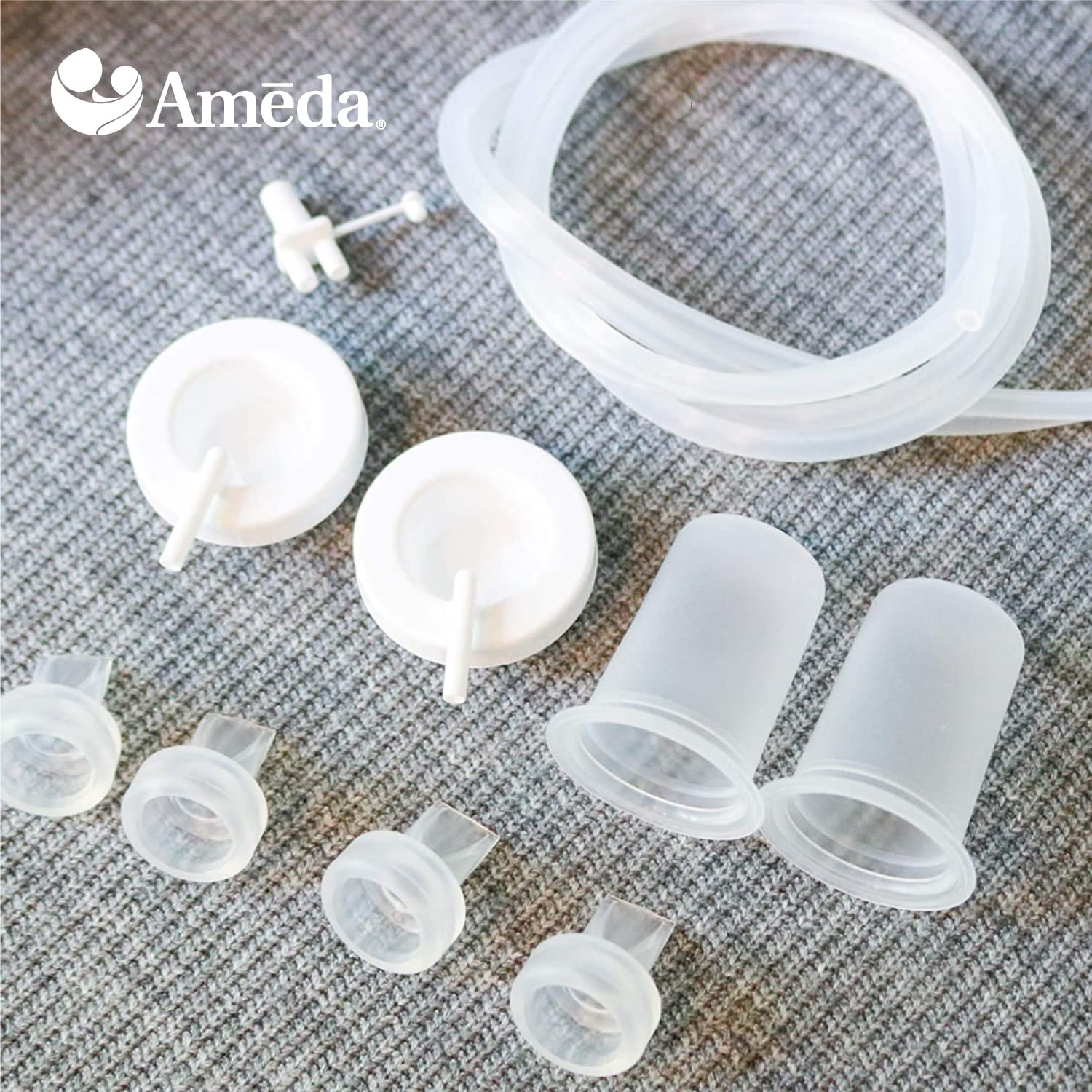 The Ameda Breast Pump Spare Parts Kit includes: 4 Valves, 2 Silicone Diaphragms, 2 Silicone Tubings, 1 Tubing Adapter, and 2 Adapter Caps.