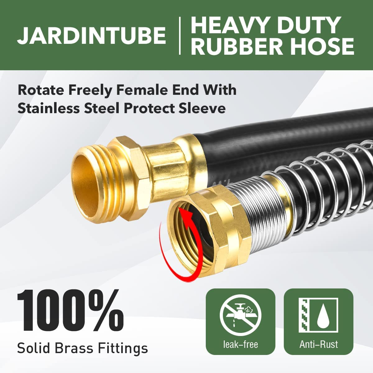 JARDINGTUBE Heavy Duty Garden Hose 5/8 inch x 100Ft, Premium Rubber Water Hose,Kink Resistant,Brass Fitting,Commercial Grade Hose With 10 Function Sprayer,Burst Pressure 450 PSI