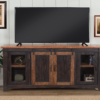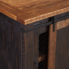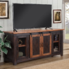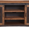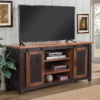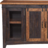 The Santa Fe TV stand is a gorgeous rustic style TV stand. Constructed of solid pine and pine veneers in an Antique Black and Aged Distressed Pine finish that offers just the right amount of distressing that can blend easily with other rustic, distressed, warehouse, farmhouse, or Loft looks. Two sliding barn style doors that slide side to side on a black metal track. The two side doors feature a metal mesh style look that adds to the rustic and distressed look. Four (4) total interior shelves are removable and adjustable providing versatile storage options for audio, video, Gaming components. Cable management cutouts are conveniently provided for the main cabinet and outer cabinets. Ideal for most 65″ flat panel TVs and up to 70″. anti-tip kit added for safety. Assembled Dimensions: 65″ L x 35″ h x 19″ d. Product materials: pine, pine veneer, metal. Assembly required.