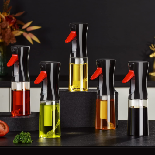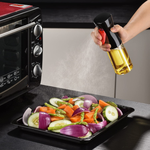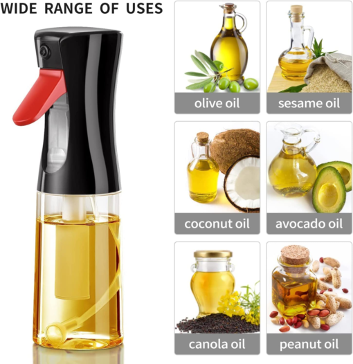 It can hold cooking oils such as olive, peanut, canola, and avocado. The spray bottle sprays 0.25 teaspoon oil each time the trigger is pulled to ensure healthier, more accurate recipes for your family and less waste, making it the most valuable tool in the home kitchen.