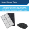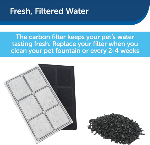 The PetSafe Drinkwell Platinum Pet Fountain gives your pet 168 ounces of fresh, filtered water. The activated carbon filter refreshes the water, while the flowing stream of water entices your pet to drink more. The built-in reservoir increases capacity and makes refills easy. The snap-on reservoir lid and rubber feet on the bottom of the fountain keep from sliding and tipping.