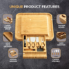 There’s a hidden drawer in our large wooden cheese board filled with goodies, including specialty bamboo cheese knives, labeling slates with a marker, a wine opener, and a carrying bag.