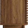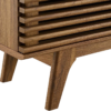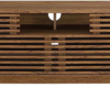 Tap into mid-century aesthetics with the Render 71″ Media Console TV Stand. This installment of the Render Collection features a durable particleboard and MDF frame with smooth wood grain laminate, four tapered legs, two center cable management holes, and two adjustable sliding slatted doors for both display and concealed shelf storage. This versatile mid-century modern living room entertainment center features a solid construction with a pleasing look and practical functionality. Perfect for media storage, this entertainment console accommodates flat-screen TVs up to 78”. Assembly required.