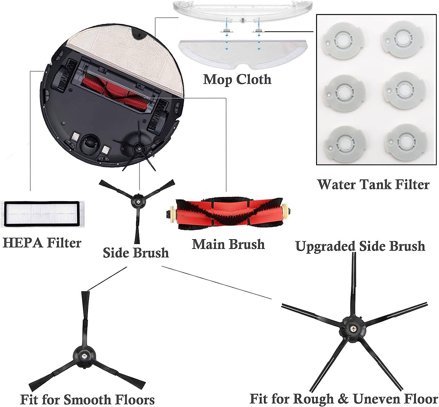 - ☘【22 Pack Set】You will get 6 great side brushes, 4 filters, 2 roller brush, 4 Mop Cloth, 6 Water Tank Filter and 2 bonuses cleaning tools.