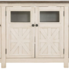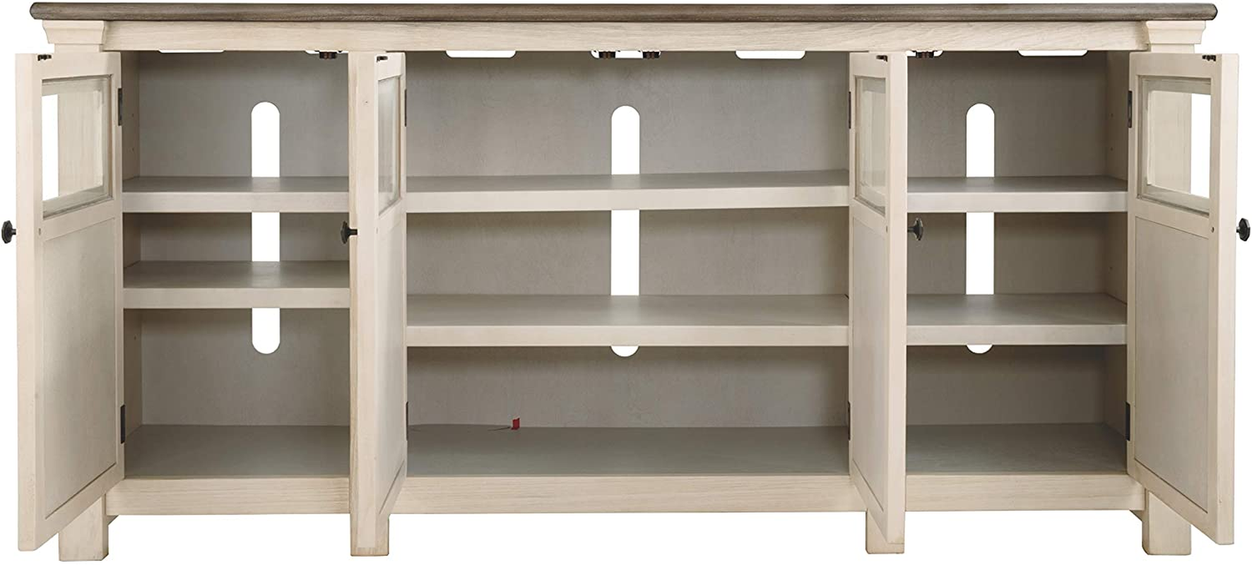 Whether your style is farmhouse fresh, shabby chic or country cottage, you’ll find this extra large TV stand perfectly in tune. Its two-tone, gently distressed finish pairs weathered oak with antique white for that much more quaint character. Charming elements include crossbuck adorned cabinets with glass inlays for peek-through flair. Ample adjustable shelving and cutouts for wire management nicely accommodate your media needs. A stylish TV stand can make your entertaining space a cozy place to relax and recharge. Our entertainment centers provide sturdy support for TVs and other electronics while hiding the wires and cords that could clutter your decor. Whether you’re looking for mid-century, farmhouse or other styles, our furnishings include display and storage space, with open and closed-door compartments, drawers and adjustable shelving. And we go the extra mile to package, protect and deliver your purchase in a timely manner.