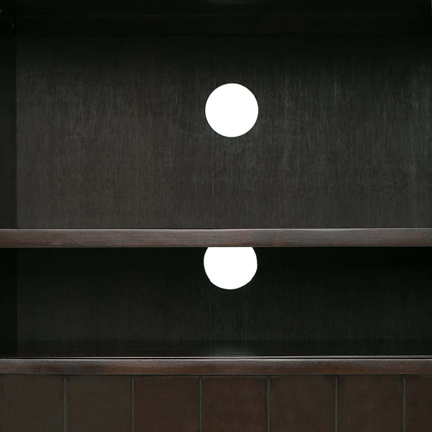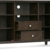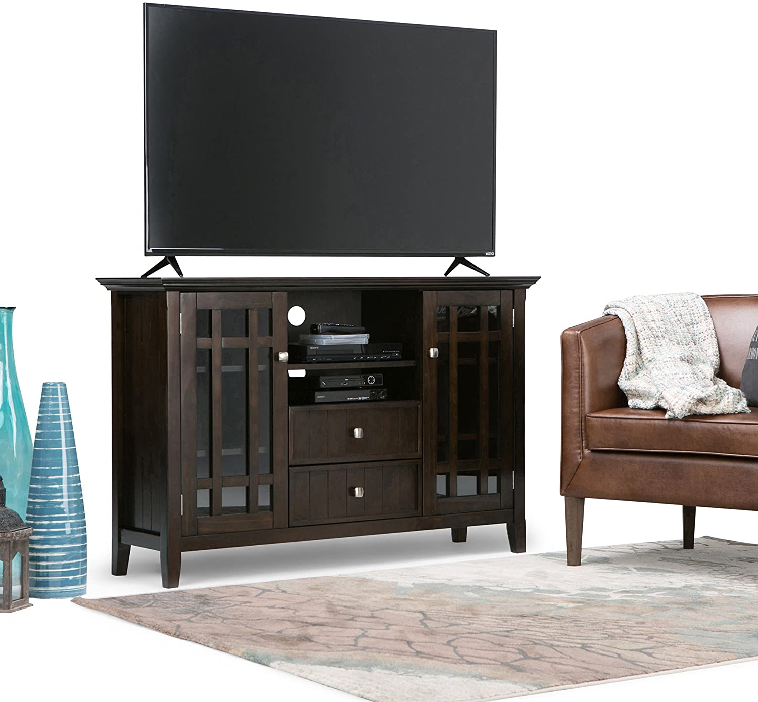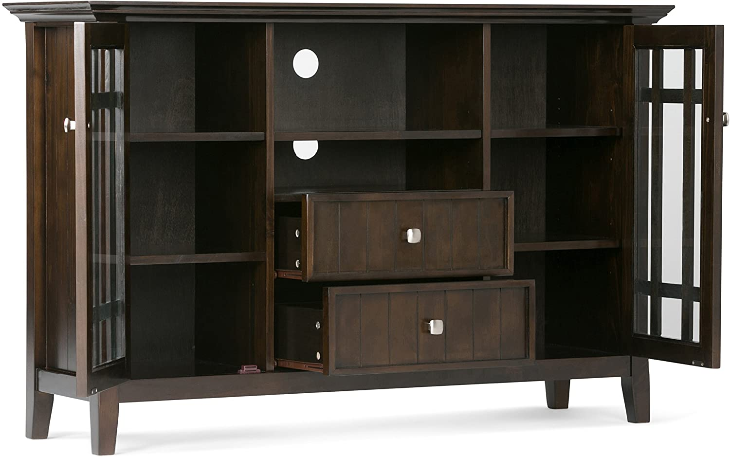You finally have your new large flat screen TV. Now you need the perfect TV Stand that will enhance your viewing pleasure. The Bedford TV Stand is perfectly sized for TVs up to 60 inches and its 35 inch height puts the TV at a level that is ideal for comfortable viewing. The Bedford TV Stand has plenty of storage and space for all your media and gaming devices. It has a large centrally located open area with one adjustable shelf and two drawers. The two large side storage cabinets open to two adjustable shelves. The unit features cord management cut-outs for easy installation of TV and media components. Open center with two adjustable shelves and cord management cutouts for easy installation of TV and media components. Style includes molded table top, beaded drawer fronts and sides, square and slightly tapered legs, tempered glass doors with cross hatch style mullions and Brushed Nickel rounded square knobs. Efforts are made to reproduce accurate colors, variations in color may occur due to computer monitor and photography. At Simpli Home we believe in creating excellent, high quality products made from the finest materials at an affordable price. Every one of our products come with a 1-year warranty and easy returns if you are not satisfied.