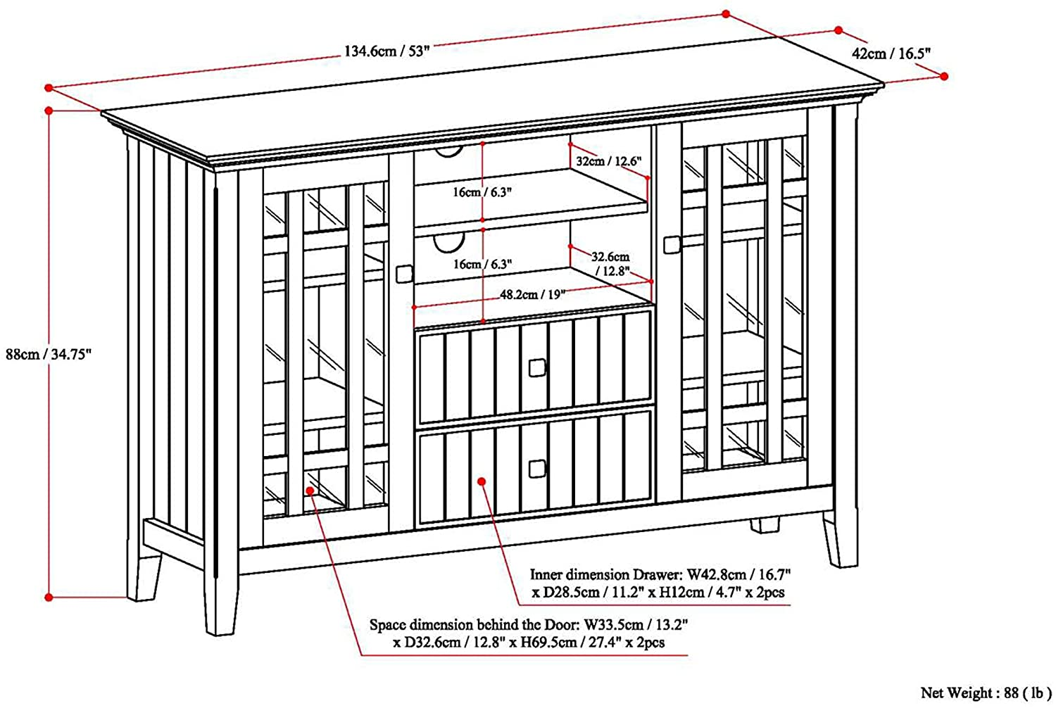 - DIMENSIONS: 16.5″ d x 53″ w x 34.7″ h