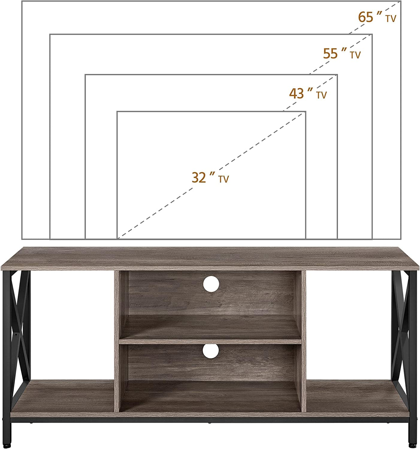 With design and functionality harmoniously blended, this industrial TV stand can serve as a tasteful addition to your stylish house and provide ample storage space to your different stuff. Crafted from powder-coated metal and CARB P2-compliant engineered wood, adding matte metal framework, this TV stand features vintage and industial elements, allowing it to well integrate various room decors. The 55” long 16” wide tabletop provides ample space for a 60-inch TV, and the 4 open storage compartments provide enough for storing your items like CDs and game collections. Besides, with all of the components, hardware and detailed instruction, simple assembly is required for this TV console table.
